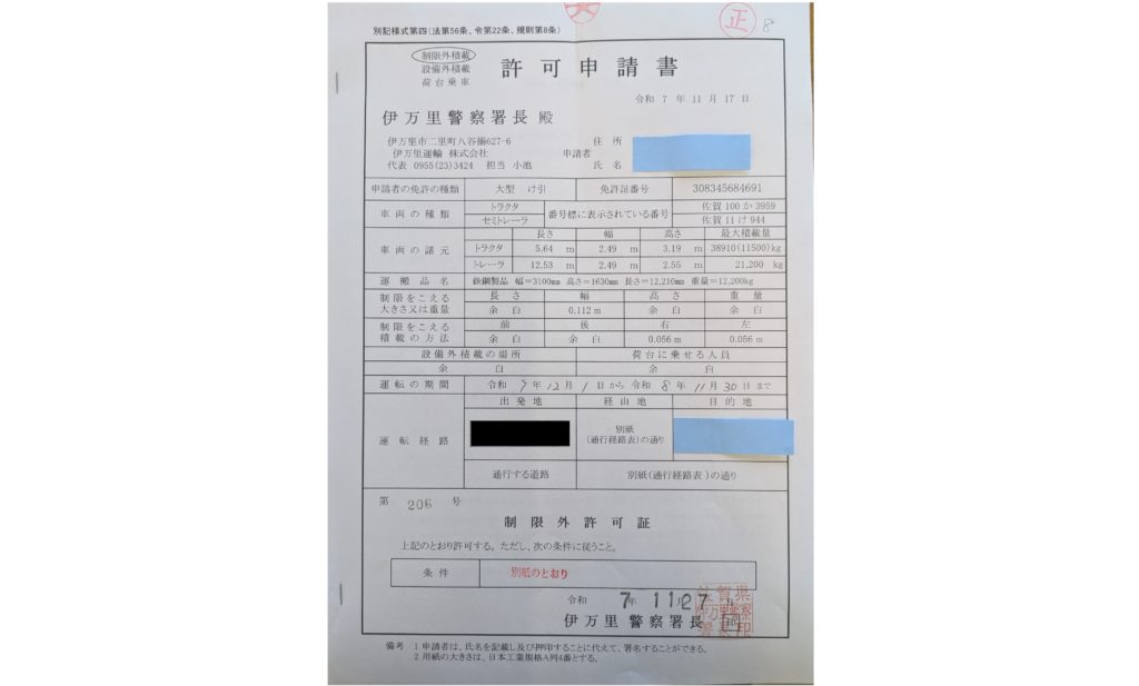 当社でも、荷主さまからさまざまな貨物の輸送依頼をいただきますが、実際に運ぶ前には、荷物の積載状態を確認し、許可申請を行っています。